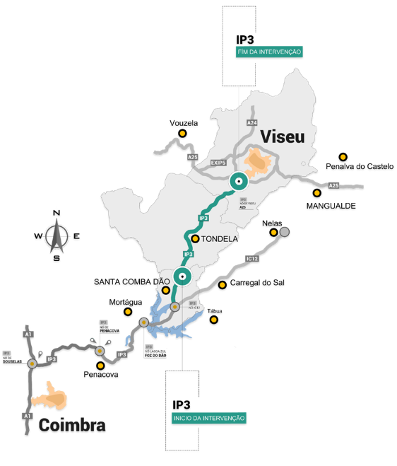 Num investimento de cerca de 103 milhões de euros, a empreitada de duplicação e requalificação do troço do IP3 entre Santa Comba Dão e Viseu compreende a duplicação da atual plataforma, numa extensão de 27,5 quilómetros, promovendo a melhoria dos níveis de qualidade, conforto e segurança rodoviária, o aumento da capacidade e a redução dos tempos de percurso.