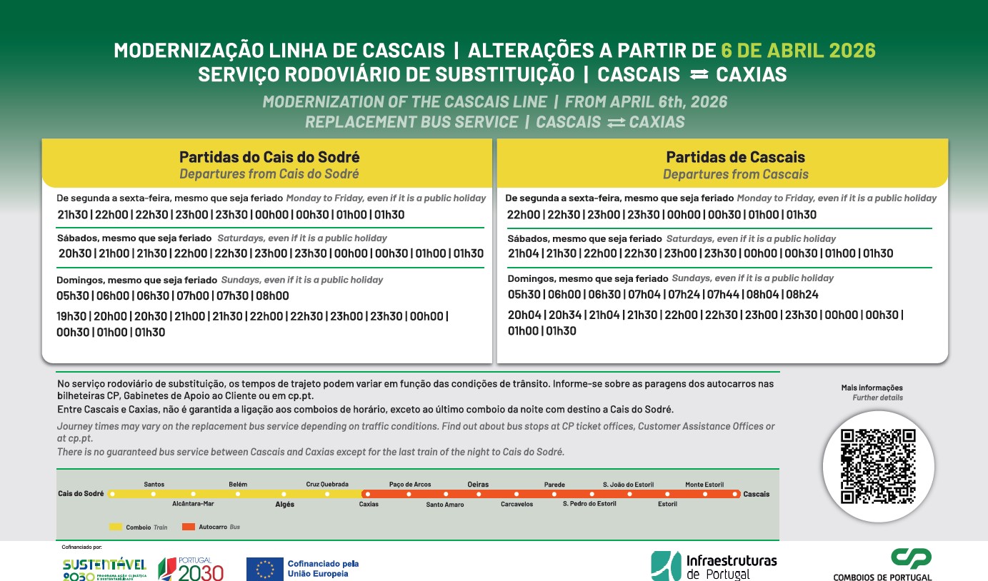 Durante os períodos de interdição total da circulação será assegurado um serviço de transbordo rodoviário, de forma a mitigar os impactos na mobilidade dos utilizadores do serviço ferroviário na Linha de Cascais.